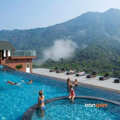 Float in the tranquil infinity pool while gazing over the rolling hills and tea gardens. During the monsoon, natural waterfalls appear in the background, creating an almost cinematic experience. A separate kids’ pool ensures fun for the whole family.